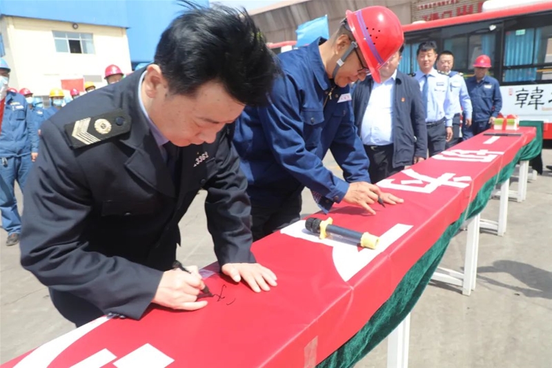 王建军代表公司向韩城市卫计执法大队及广大职工做出承诺:一是加强制度建设 太阳集团在线,持续完善职业病防治责任体系;二是规范职业病危害检测和评价,做好职业病危害治理;三是强化培训教育,严格落实职业健康监护;四是如实申报和告知职业病危害,保障职工合法权益。