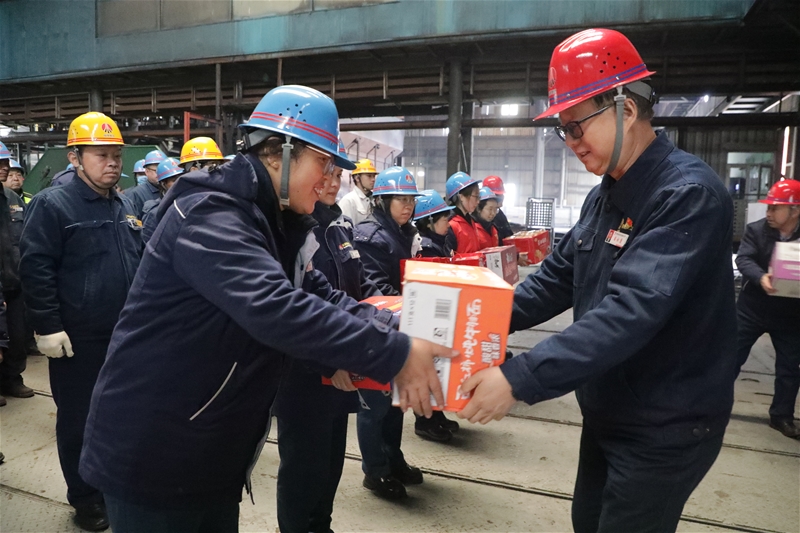12月18日,公司党委委员,工会主席薛社康到轧钢厂板带检修现场 太阳集团下载,看望,慰问奋战在检修一线的干部职工,并为他们送上牛奶,面包,方便面,饮料,香蕉等慰问品。