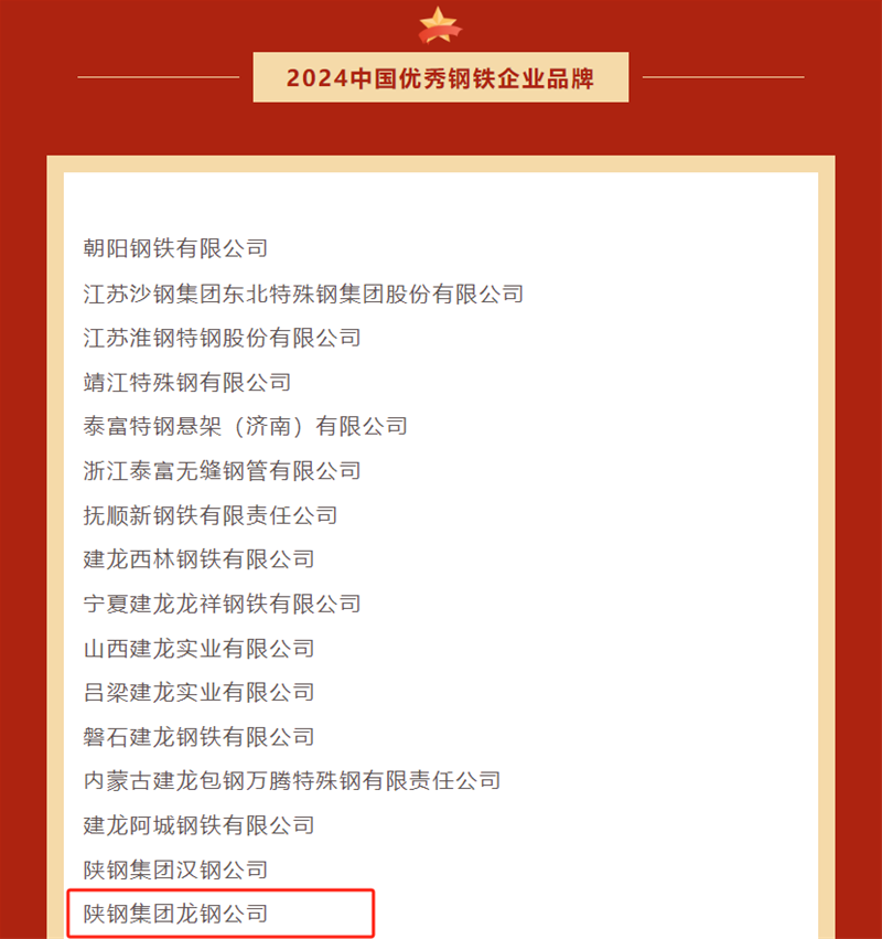 5月10日,第8个中国品牌日,中国冶金报社权威发布2024年度中国钢铁品牌榜,陕钢集团龙钢公司荣膺“2024中国优秀钢铁企业品牌” 太阳集团下载。