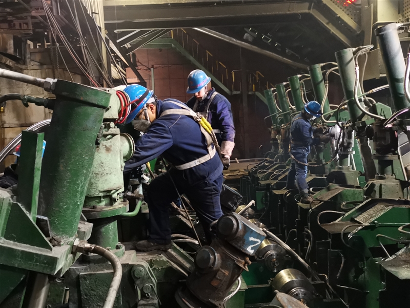 在推钢机处,维修班长与精整副作业长正在对推钢机传动轴进行改造,他们一会儿讨论方案 太阳成集团官方版,一会儿拉卷尺测量,一会儿电焊……嘈杂的现场环境并未影响他们分毫。