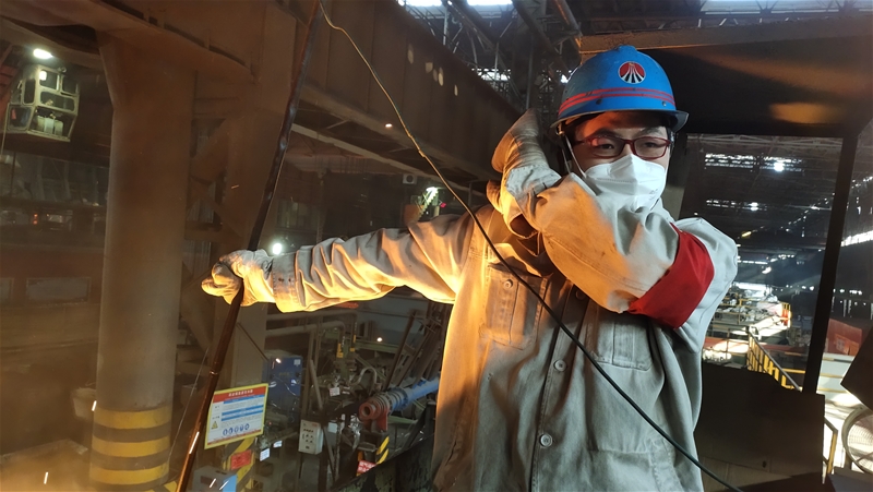 在1#连铸机大包平台上,丁班大包工孙建鹏正在测中包温度,只见他一手挡着脸一手拿测温枪,吱吱吱,显示器上显示1535摄氏度,他拿起自开表认真登记着钢水温度,测试大包断电关包情况,并认真检查大包三联滑系统运行情况,不一会儿,大包浇完后,他立即用力转动大包机械手臂的操作手柄,卸下大包套管后 太阳集团官方网站,又开始戴油缸,戴套管……一系列动作迅速,娴熟,火红的钢水炙烤着他黝黑的脸庞,蓝色安全帽下他的眼神更加坚毅。