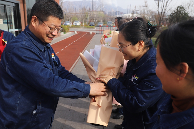 图一:3月5日一大早,该单位工会主席带队为女工们送去了鲜花和祝福,祝福她们生活幸福,工作顺利 太阳集团官方网站,事业有成,并充分肯定她们在各个岗位上辛勤耕耘,自强不息的精神,感谢她们为企业发展做出的积极贡献。