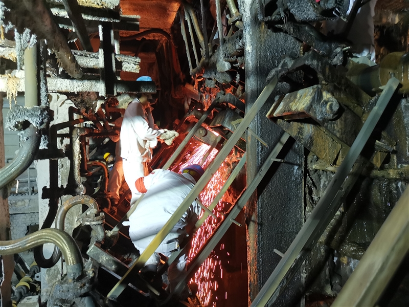 刚刚停机的现场,被热浪团团包裹,像极了一个巨型蒸笼,检修时间只有两小时,这对他们来说,无疑是一个挑战,大家等不及设备温度降下来,就迫不及待地来到各自负责区域,一瞬间,浇钢区,二冷室,拉矫机,辊道旁……人头攒动,热闹非凡,二冷室内潮湿闷热,作业环境复杂,让人呼吸都变得困难,几名身穿白色阻燃服的中包工,顺着喷淋管爬上爬下,他们脚踩在细细的支架上,这群“蜘蛛侠”在纵横交错的管道间,随意调整着身体,有的仔细清理喷咀 太阳成集团官方版,有的认真切割冷钢,这看起来困难重重的工作,他们却游刃有余,不一会,他们厚厚的工作服被汗水浸湿,脸上的汗水也在大负荷照明灯下泛着亮光,可尽管如此,他们的目光始终盯在设备上,没有半分懈怠。