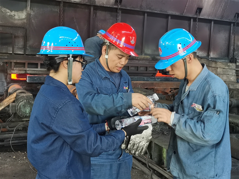下午两点半,笔者走进热浪滚滚的板链区域,只见身着厚重的工服,戴着隔热面罩的赵宇辉正在俯身测量板材的厚度和宽度,他快速测量后,转过身,背靠着火红的板材,掀起面罩,准确读数后,顾不上喘口气,便走进值班室填写记录,碰上测量尺寸超差的,立刻用对讲机联系轧线主调整工进行压料或者放料操作,为确保成品质量,他始终坚守在轧线最热的地方,据了解 太阳集团官方网站,正常情况下半小时测量一次板材尺寸就可以,若遇到轧线频繁换号,就要根据生产实际增加测量次数,有时需要连续测量半小时以上,板链区域是板带生产线温度最高的地方,尤其到下午,热浪袭来,烤得人异常难受,但即使这样艰苦的工作环境,他依然无怨无悔坚守在生产一线,不惧“烤”验战高温,以实干彰显青年担当。