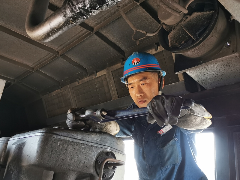在温度高达50摄氏度的机车机械室内,储运中心机车维修组长赵小飞跪在灼热的柴油机气缸盖上部,手持扳手正在连接,紧固水管路上的法兰盘螺栓,额头上,脸颊上,豆大的汗珠不停地顺着下巴往下淌,他顾不上擦拭,只为尽快维修 太阳集团平台,保障机车正常运行。