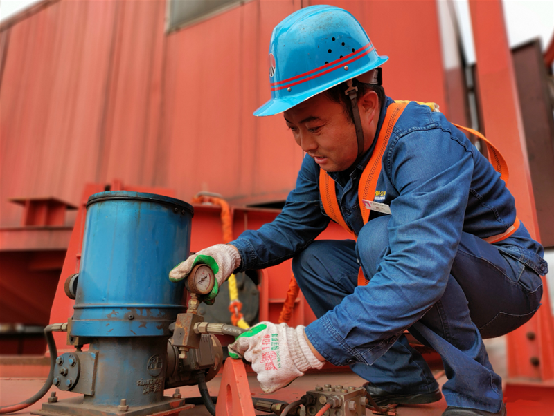 在距离地面13米高的龙门吊上,储运中心设备管理员薛涛系好安全带,正在润滑压力表,烈日当头,没有一丝风,可他丝毫不为所动,用责任与担当守护着设备顺行。