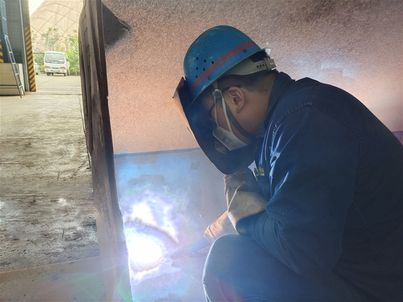 烈日炎炎,工房外“大烤”,工房内“小烤”,穿着厚厚的工作服和长袖手套的电焊工侯宪军正在进行铲刃更换工作,只见他微蹲在铲斗旁,无视湿透的衣服和额头的汗水,细致用心地做好每一处焊接工作。