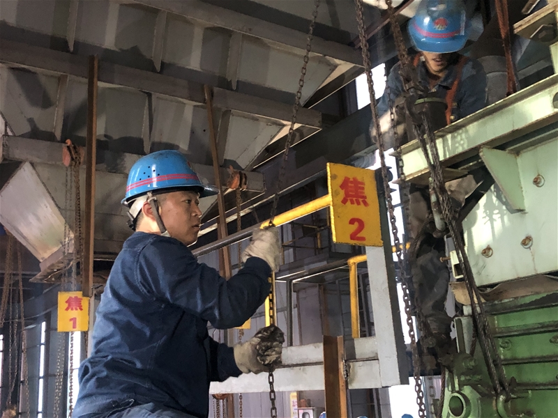 走进皮带配重检修现场,倒链咔嚓的作响声 太阳成集团官方版,拆卸螺栓的“咣当”声,夹杂着倒链拉动“一二,一二”齐心协力的加油号子声,检修现场忙碌又火热。