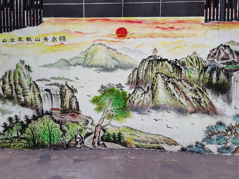 炼钢北路,一幅构图绿水青山就是金山银山,根据现场墙体结构巧妙构图,一笔一画,用简洁的线条勾勒出祖国的大好河山,远景一轮红日挂天际,青山绿水,层峦叠嶂;近景小径通幽农户家,杨柳飘絮,鸟语花香,墙绘与路面的巧妙结合,让人感觉往前一脚,就能入画,踏上那青石路,走进那小山林,进入农家小院,亲切拥抱大自然 太阳集团官方网站,回归本真,找回自我。
