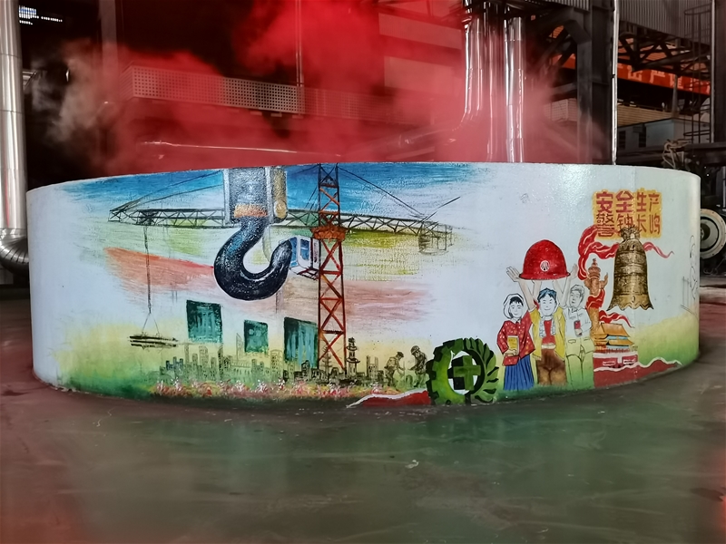 炼钢二区连铸旋流池外围墙 太阳集团在线,是一幅以“安全生产 警钟长鸣”为主题的墙绘,鲜红的帽子,金黄的警钟,深色的行车挂钩配浅色背景,明淡色彩的冲击,安全主题呼之欲出,在观画的同时,不禁反思自己的行为是否违章,是否符合标准化……用鲜艳的墙绘时刻警示安全,美化现场环境,成为瞩目耀眼的地标。