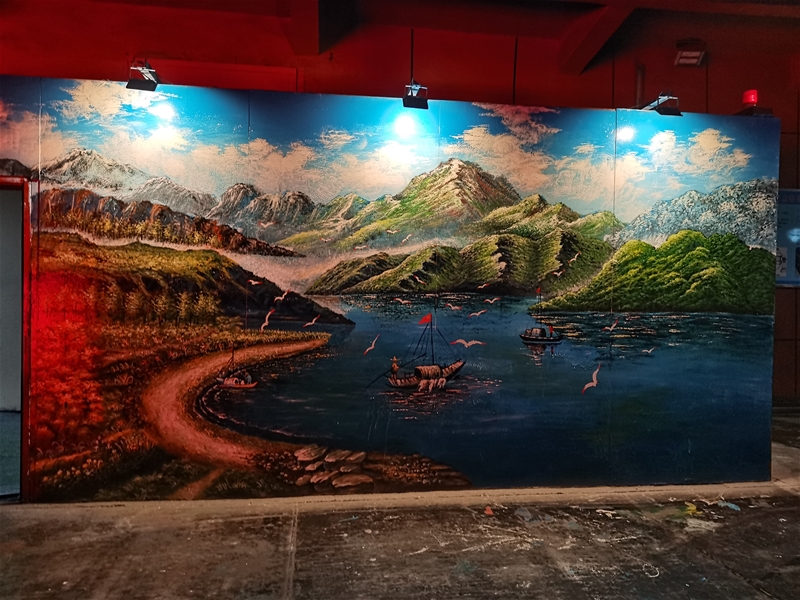 炼钢二区转炉参观通道外墙,两幅精妙,磅礴大气的山水景观墙绘分列5,6#转炉前,一区一景,景景不同,互有联系又自成一体 太阳成集团官方版,体现了钢铁工人粗中有细的作业特性和魅力,似江山如画,写意人生,又似乘风破浪,未来可期,用色大胆热烈,配合和光影创造的明暗环境,充分满足了当代工人高情感,高审美的心理诉求……给职工创造了一个清新的生产现场,在工作之余,愉悦身心,富足精神,也是十里钢城一道独特风景,炼钢的文化名片。