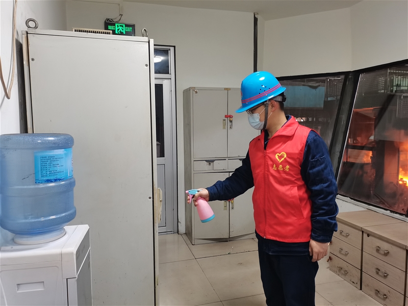 “外协人员行程码查看和体温仪检测均已完成,全部合格,”“今天值班室,卫生间 太阳集团app,会议室均已进行2次消杀,”“机修工段从西安返回人员已全部排查上报,”青年志愿者赵艺智逐一向志愿服务负责人汇报工作情况。