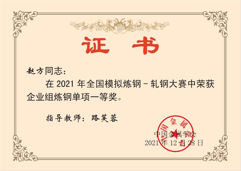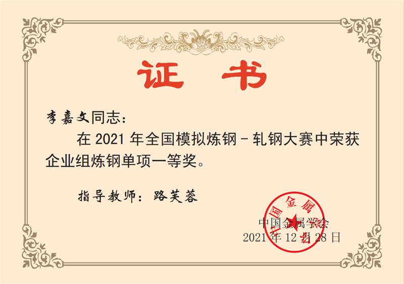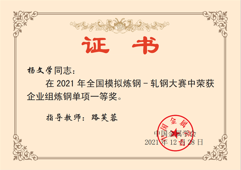 近日,从中国金属学会传来喜讯 太阳集团下载,公司炼钢厂转二作业区技术主管杨文学,炼钢厂3#转炉炼钢工赵方,炼钢厂5#转炉炼钢工李嘉文3名同志在2021年全国模拟炼钢-轧钢大赛中均荣获企业组炼钢单项一等奖。