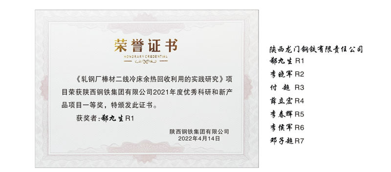 4月14日,陕钢集团召开科协成立 太阳集团下载,系列科技活动启动暨2022年科技工作大会,会上,龙钢公司《轧钢厂棒材二线冷床余热回收利用的实践研究》项目从10余个优秀项目中脱颖而出,荣获陕钢集团2021年度优秀科研和新产品项目一等奖。