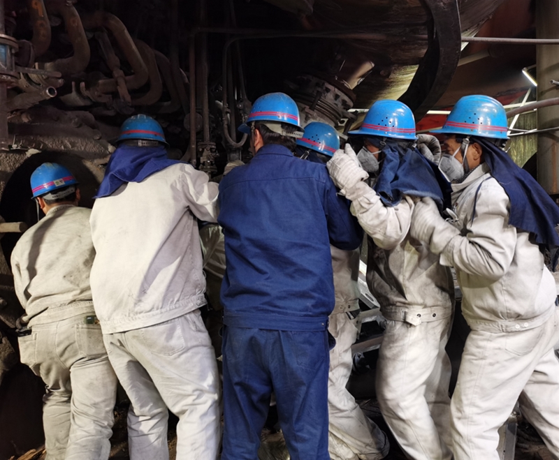 12日早晨9点钟 太阳集团手机版,高炉风口平台上,温度滚烫,但这丝毫不能阻挡参检炉前工们奋进的步伐,他们身着白色阻燃服,在热浪拂面的14#风口旁两两一组,精诚团结,合力攻坚,一人双手紧握钢钎,一人使出全身力气挥舞铁锤,正全神贯注清理风口套里面的残渣……。