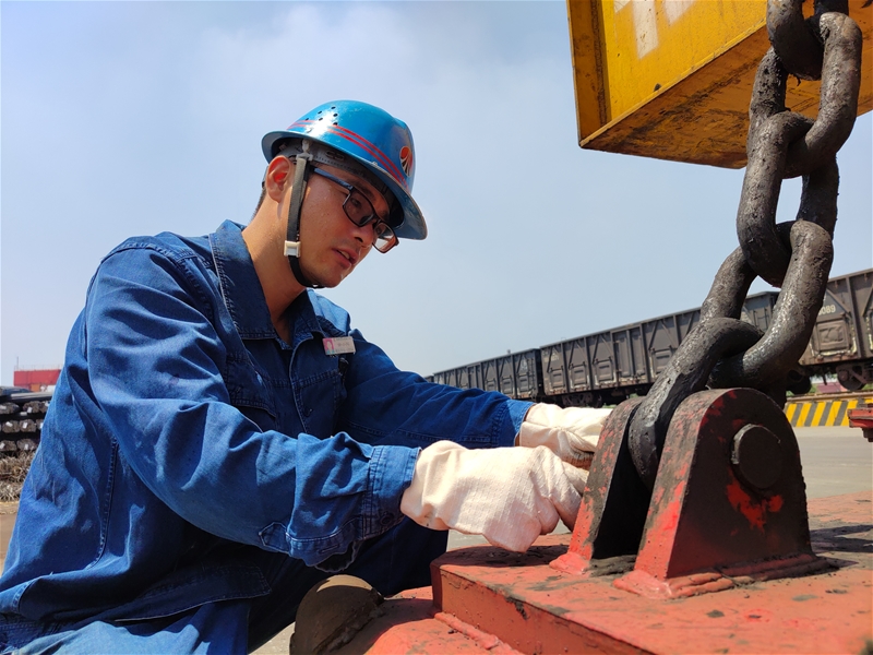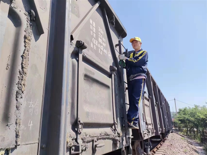 正值一天里温度最高的时候,地表温度超过40℃,车体被晒得滚烫,只见两名货运员穿梭在待检测车辆旁,一会攀爬上车皮检查装车情况,一会儿蹲下身查看车皮底部,两端,查看有无漏焊,脱焊等情况 太阳成集团tyc33455,有时看到他们拿起铁锤在车门扣铁上敲敲打打,确保每一个车门扣铁完全入槽,有时看到他们对每一节车皮门子的紧固程度进行检查,检查铁丝的长度及加固情况,仔细履行好工作职责,直到全部完成后,他们走向下一节车皮。