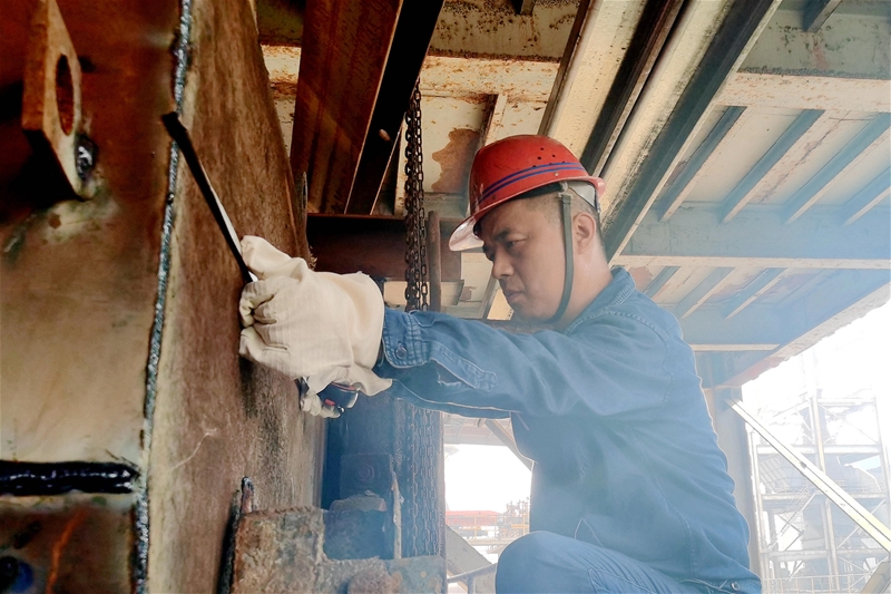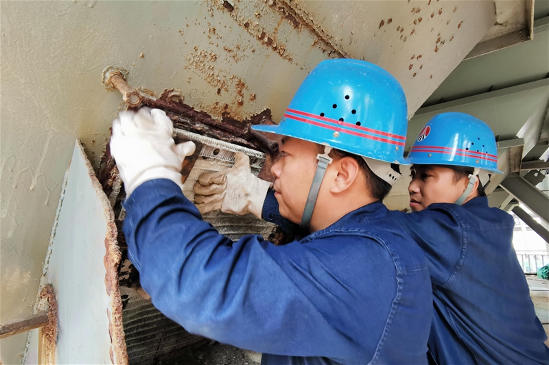 现场,他们时而站时而蹲,时而弯腰时而低头,努力寻找最合适的姿势用力敲打仓壁结块水渣,短短10分钟,他们已挥汗如雨,鬓角串珠似的汗水顺着下巴滴到蓝色工装上 太阳成集团tyc33455,看着被汗水浸透衣衫的他们,笔者突然感受到这才是最美的钢铁战士。