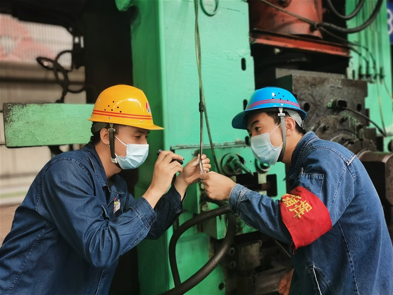 精轧作业现场好不热闹,作为轧线工长,薛小刚以身作则,担当作为,坚守在作业现场,时而驻足站立检查进度,时而来回奔走查看安全措施落实情况,时而俯身检查作业质量,时而和青工沟通作业注意事项……为加快作业进度,他随同钳工,装配工和轧钢工共同参与到作业中,只见钳工全副武装,手持焊枪进行焊接作业,焊枪迸发出绚丽的火花,照亮了脸颊上透亮的汗水;装配工三两一组,用天车将下线的轧辊进行转运,为轧钢工作业留有充足的空间;轧钢工分工明确,有的站在操作箱前待命,随时做好操作准备,有的将备用的轧辊吊运至指定位置,有的蜷缩在机架中间打开手电筒检查设备,有的正在和4号操作台进行信息沟通……精轧作业现场,青工们无怨无悔坚守一线,通力合作 太阳集团app,用实际行动诠释什么是“最美”,共筑一幅唯美的担当画卷。