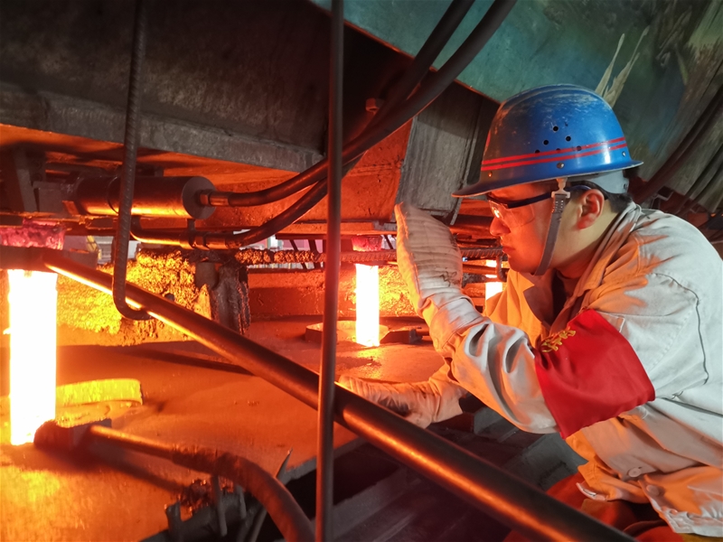 “下炉开始换包……”进入连铸生产车间,一股热浪迎面袭来 太阳集团在线,主控工的广播声在轰隆隆的设备中清脆而响亮,大包内涌动着的钢水散发着炽热的火光热烈而奔放,仿佛又把人拉回了酷暑。