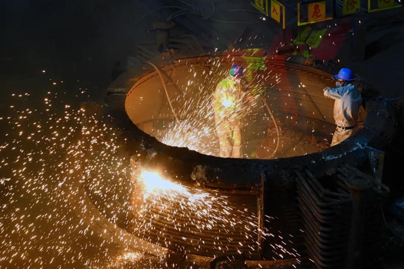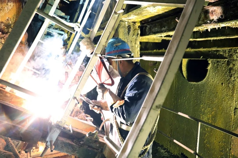 检修现场 紧张有序 忙而不乱一个个忙碌的身影穿梭在各个角落他们在狭小的空间里拆卸装置打磨焊接安装设备璀璨的钢花和叮叮咚咚的敲打声热闹非凡