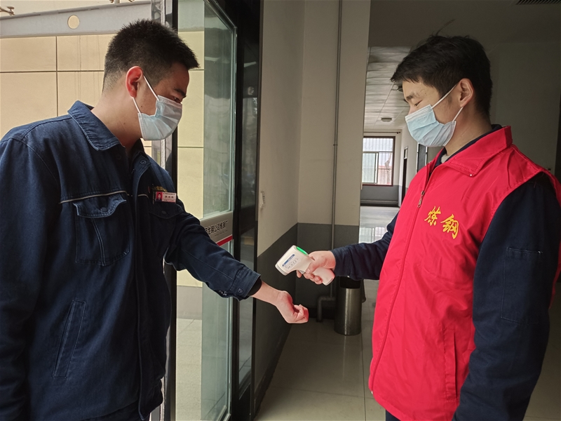 “请出示健康码 太阳集团平台,行程码,测量体温……”11月24日6:30,王智身穿红马甲在炼钢厂办公楼门口测温。