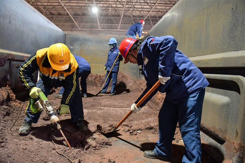 该单位冻矿卸车突击队坚持随时待命原则,分组行动,通过洋镐,电镐 太阳集团在线,大锤,方锨等工具,对各车厢底部,四角冻结的物料进行铲动,清理,既做到颗粒归仓,又保障了公司生产用料。