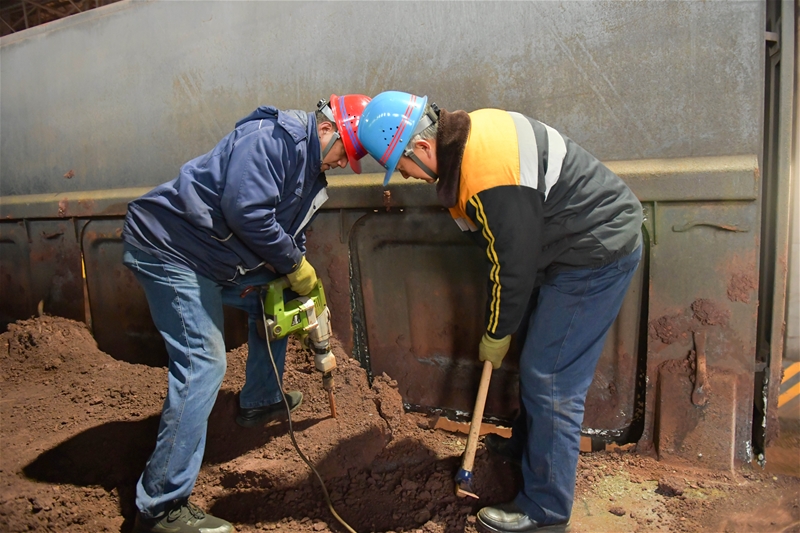 “这是巴西混合粉,粘度高,水分大,冻结程度比较严重,”说着,突击队成员纷纷舞动着手中的铁锨,大锤,洋镐,试图将一块块僵硬的冻矿从车皮上“砸落”下来 太阳成集团官方版,但在零下13度的极寒天气,在敞车里经历长途运输的巴西混合粉早已冻成硬块,“今天的矿很硬,用铁锤,洋镐根本撬不动,”早晨八点,火车车厢里没有矿粉的地方依附着厚厚的一层冰,站在车厢里干活,不一会手脚都冻麻了,矿粉太硬,即使大家竭尽全力,矿粉还是岿然不动,“马上联系使用电镐,”现场调度人员说道,待电镐送来后,只见党员刘少平迅速接过电镐,随着“突突突”的声音,电镐成功钻进厚达40公分的矿粉中,一个“洞”,两个“洞”……经过一番攻坚,刘少平便将跟前的矿粉打成了“筛板”,随即用电镐从矿粉的底部钻起,就这样,“硬骨头”成功被“啃下”,在旁边拿铁锨的同志们配合着挥动铁锨,将矿粉锨出车厢……半天后,破矿作业还在进行,电镐,大锤,洋镐,铁锨,这些工器具交替使用,突击队成员相互配合,攻克了一车又一车冻矿,他们头上也早已腾起股股热气,与严寒的天气形成鲜明对比。
