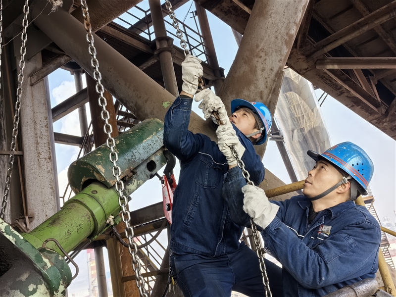 在喷煤三区60米高空平台,维修工正在更换布袋,凛冽的寒风,拍打在他们脸上 太阳成集团官网,但他们的热情丝毫不减,“大家注意,这个布袋需要小心拆下来,” 经验丰富的老师傅何江永提醒道,他责任心强,时刻关注着工作中的每一个细节。