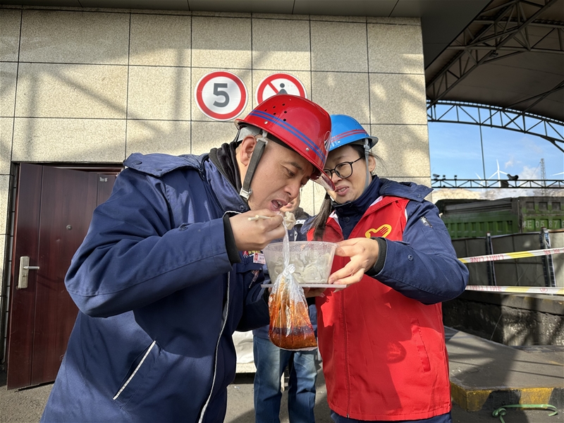 “今天的姜糖水味道格外浓郁,饺子也美味可口,不仅暖身还暖心,实在是太感谢了。”当党员志愿者将热腾腾的姜糖水和饺子送到检修人员手中时,金小刚连声道谢。