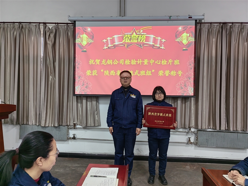 2023年,陕西省总工会发文命名了50个“梦桃式班组”,陕煤集团共有4个班组获此殊荣,其中龙钢公司检验计量中心检斤班名列其中,2月5日 太阳集团下载,公司党委委员,工会主席薛社康为检验计量中心检斤班授牌。