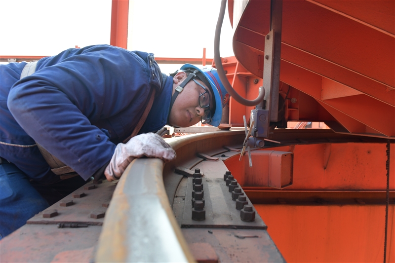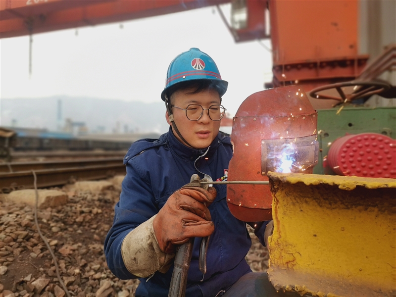 在公司新站台 太阳成集团tyc33455,电焊工薛增辉正对天车阻挡器进行加固焊接,在一点一焊中,用精湛的技术为设备保驾护航。