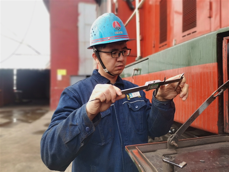 机修工李星正对机车制动活塞进行精准测量,确保设备平稳运行 太阳集团在线,实现寿命最大化。