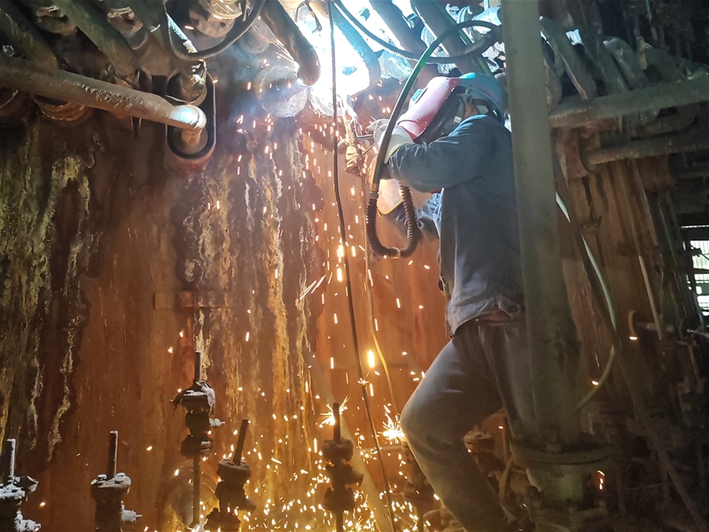 “请递一下敲渣锤……”看着即将焊接饱满的焊缝 太阳集团注册,外协单位焊工李东阳在离平台60厘米的冷却壁管道下,平躺着进行焊缝仰焊作业。