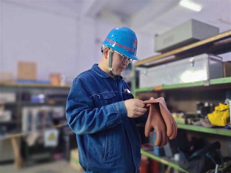 在电气试验室里,电工薛飞麻利地给绝缘手套注水,用铁夹子夹住绝缘手套两边,把导电铜丝放进手套里,然后快速走到距离手套一米远的操作台前,蹲下身子,低头打开仪器开关 太阳成集团官方版,升到规定电压,观察电流表,再抬起头,目不转睛地盯着那只注满水的手套1分多钟,看到电流没有异常,手套没有击穿,绝缘性能满足要求后,他又投入下一项试验中。