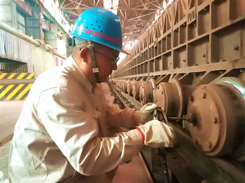 台车轨道旁,台车工薛峰虎正在对台车滚轮区域设备进行润滑保养 太阳集团登录,129个台车见证了他日复一日的坚守,50℃的高温环境“烤”验着他,摆动带,宽皮带,烧结机,台车小格……见证了他矢志不渝奋斗的青春足迹。