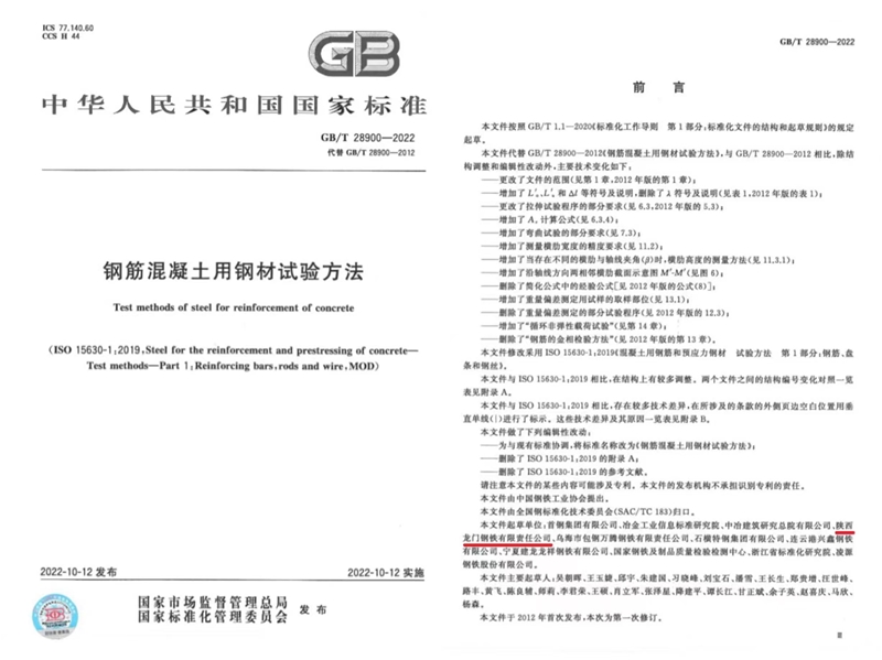 近日 太阳集团下载,由龙钢公司参与起草的《GB/T28900-2022钢筋混凝土用钢材试验方法》正式发布。