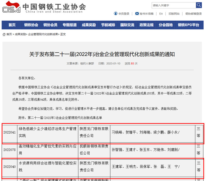 近日 太阳集团下载,从中国钢铁工业协会传来喜讯,在第二十一届(2022年)冶金企业管理现代化创新成果评选中,公司《绿色低碳少尘少渣经济冶炼生产管理实践》《水资源利用综合治理与智能化管控实践》两个项目荣获冶金企业管理现代化创新成果三等奖。