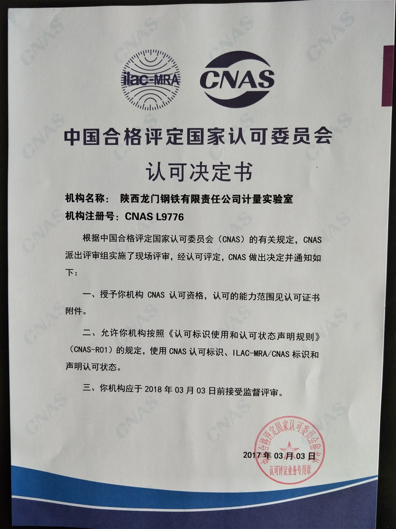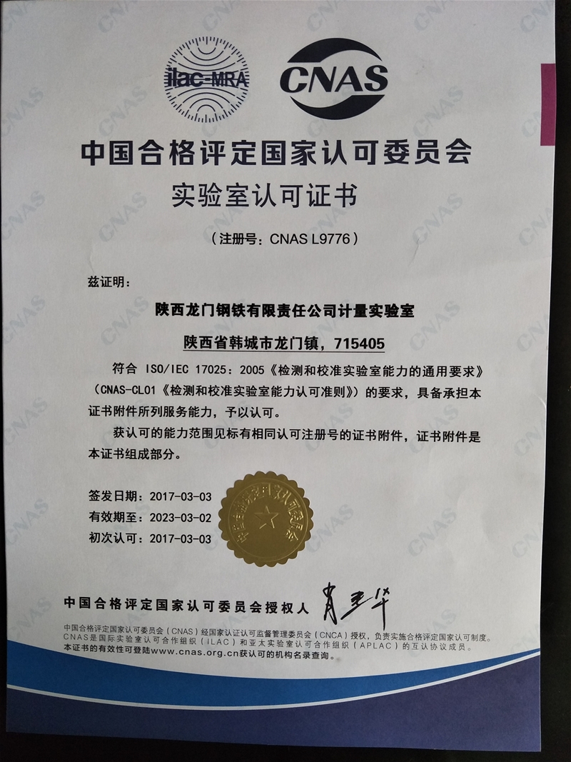 2017年计量实验室经国家认可委员会认可具有第三方校检资质,取得CNAS实验室认可证书,现有2名计量检测工程师,2名助理工程,7名国家注册计量师 太阳集团官方网站,为确保计量检测数据的准确可靠,与中国计量科学研究院,中国测试技术研究院,陕西省计量科学研究院等法定计量技术机构建立了有效的量值溯源网络。