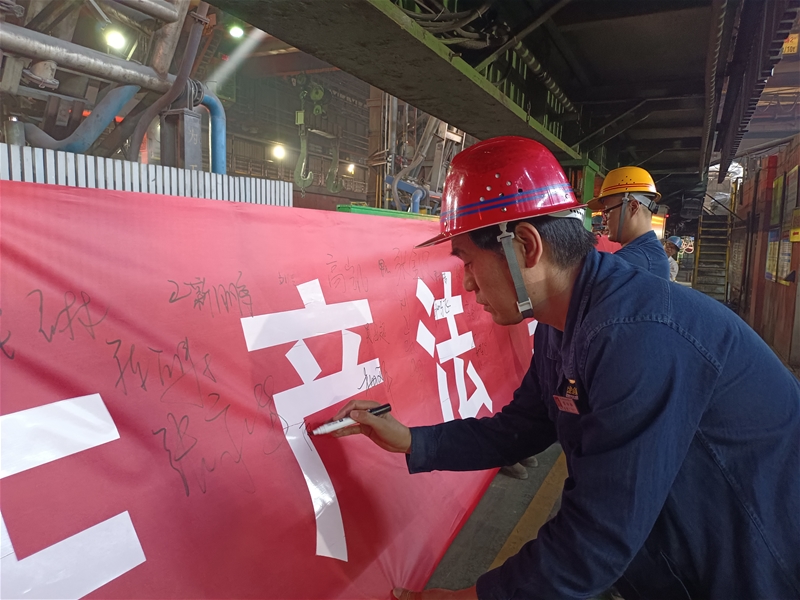 “时刻注意安全,认真作业;遵守安全法规 太阳集团在线,履行安全职责……”3#连铸机平台上进行“安全生产月”启动仪式。