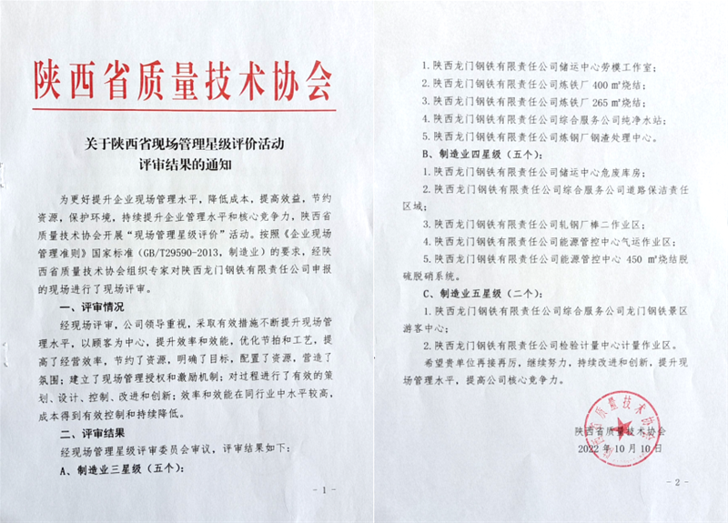 龙钢公司深入推进现场管理星级达标工作,认真策划部署,常态化开展6S考评,六个一,对标交流,“六个百分之百”活动,按照“零容忍,无死角,全覆盖”要求,围绕环保攻坚过程,生产实际和文明施工中存在问题,相互对标,系统治理,持续巩固,实现现场管理共同提升,模拟开展林业碳汇造林项目 太阳集团网页版,传播绿色低碳生态理念,将产业结构与生态经济相结合,大力开展植树造林,增加绿地面积,提高绿化覆盖率,落实绿化专业管护,加强绿化养护精细管理,保障苗木茁壮生长,提升绿化效果,2022年,经陕西省质量技术协会现场星级评价,龙钢荣获省级星级现场12个(五星级2个,四星级5个,三星级5个),成为陕西省荣获星级现场最多的企业,并荣获“省级园林式单位”称号。