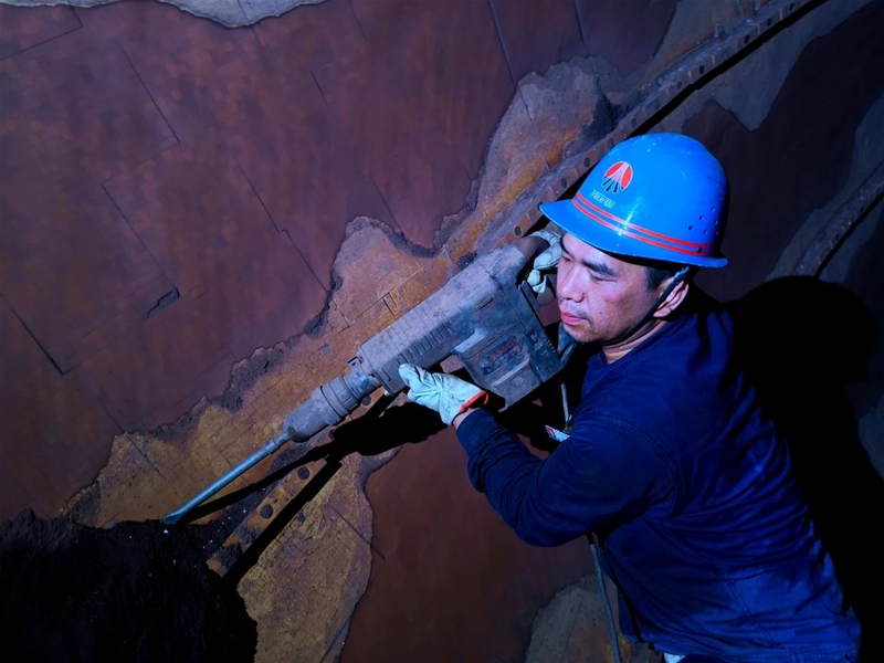 “休息一会儿,换我来,”班长张栋洪亮的声音穿透了风镐的轰鸣声,他接过工具,双腿稳稳扎成弓步,双手紧握风镐,奋力向上举起,瞄准,发力,动作干脆利落,风镐精准砸向大块积料,这看似简单的重复动作,要用尽全身力气,连他脖颈上的青筋都清晰可见……不到半小时,深蓝色的工装已经被汗水浸染成墨色,紧贴在背上,他们无暇顾及,继续更换混料筒,“混料筒内作业难度大,温度高 太阳成集团tyc33455,我们必须轮换作业,才能保证清料工作高效进行,”被轮换下来的混料工卫晨喝了口水,抹了把汗,又为下一次清理混料筒作业准备着。