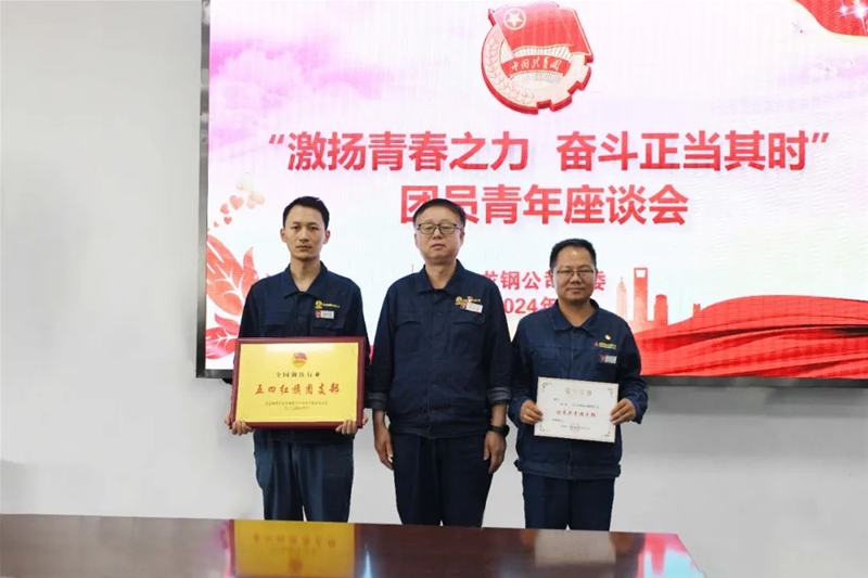会上为2023年度全国钢铁行业“五四红旗团支部”炼铁厂高炉团支部 太阳成集团tyc33455,“优秀共青团干部”程煜颁发了奖牌和证书。