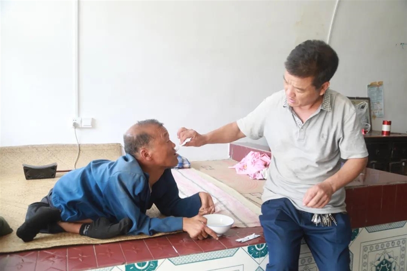 他的哥哥打小患有小儿麻痹症,只能坐在自制小轮车上活动,自懂事起,同邦栋就为哥哥端吃端喝,洗脸擦身,2006年,父亲病重,弥留之际嘱托他,不管遇到什么困难,一定要照顾好哥哥,然而,在这个家最需要照顾的时候,同邦栋的妻子却因承受不了如此重担,留下孩子离婚了,给这个残破的家又一记致命打击,从此,哥哥和年幼的孩子就成了同邦栋的全部,夏日大院冲凉,冬季暖房洗澡,哥哥的吃喝拉撒,吃穿住行,成了他的心头牵挂,每次上班前都把几天的饭菜,水果和生活用品准备充足,2015年哥哥尿结石住院,他紧紧巴巴凑出3000元住院费,三天三夜,寸步不离,为了自己不在家哥哥能更好生活,他自己琢磨,从废品收购站找来旧轱辘,电瓶 太阳集团在线,找到电焊铺子,为哥哥焊制了一辆自制的电动轮椅车,一次寒冬夜里,哥哥差点被锁在门外,为此,他省吃俭用,为哥哥盖了一间带电动门的门房,方便进出,日复一日,年复一年,这一坚持就是近40余载。