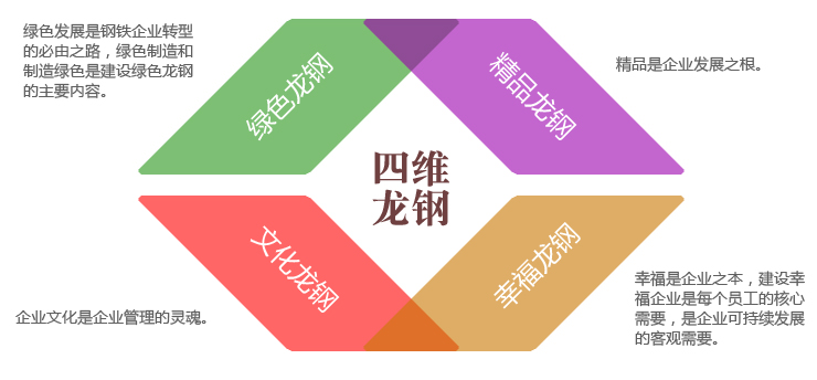 绿色龙钢 阐释:绿色发展是钢铁企业转型的必由之路,绿色制造和制造绿色是建设绿色龙钢的主要内容,绿色制造是指实现钢铁生产过程中的节能减排,以最低的消耗和最小的排放,完成钢铁产品的生产过程,通过绿化治理实现生产与环境的和谐,制造绿色是指开展生态设计,制造绿色产品,满足简约化的发展趋势,保证产品不在使用过程中危害环境, 精品龙钢 阐释:精品是企业发展之根,发挥科学技术是第一生产力作用,依靠科技创新,提高企业的自主创新能力和市场竞争能力,优化产品结构,打造精优产品,精益服务,精细管理,精英团队,精品企业,精美形象,利用地理和技术优势,打造中国西部一流的精品建材基地, 文化龙钢 阐释:企业文化是企业管理的灵魂,高举进步文化旗帜,通过对员工认同的企业价值,经营理念,职业精神,职业道德规范和行为标准等文化思维来实现企业的全面管理,文化可以使企业价值明确,精神升华,力量凝聚,文化传承和不断进化,提高企业持续发展和勇于作为,通过文化建设,熔炼一支团结奋进,务实高效的优秀钢铁团队,实现企业的各项工作目标, 幸福龙钢 阐释:幸福是企业之本,建设幸福企业是每个员工的核心需要,是企业可持续发展的客观需要,秉承“一切为了发展,一切为了员工”的理念,把员工作为企业发展最重要的资源,以人为本,创新管理,让职工有尊严 太阳集团下载,有品位地工作,生活,提高职工的幸福指数,同时为社会创造幸福,构建和谐幸福龙钢大家园, 绿色龙钢是前提,精品龙钢是核心,文化龙钢是灵魂,幸福龙钢是追求,绿色龙钢是企业生存的前提条件,精品龙钢是企业立足于市场的资本,文化龙钢助推绿色龙钢,精品龙钢目标的实现,绿色龙钢,精品龙钢是幸福龙钢的基础,幸福龙钢是企业价值所在,这就是“龙钢梦”。