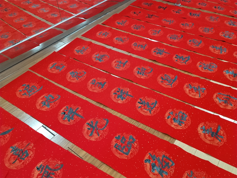 活动现场,红纸翻飞 太阳集团官方网站,墨香四溢,书法家们情绪激昂,挥毫泼墨,笔走龙蛇,一起一落之间,一幅幅用隶书,行书,草书等书写的大红春联完美呈现,职工们个个喜上眉梢,赞不绝口,争相邀请书法大家为自己写春联,并纷纷上前主动帮忙,有的帮忙抻纸,有的帮忙将写好的墨宝晾晒到空地上,欢声笑语连绵不绝,现场气氛越来越浓,书法大师们也越写越有激情,不一会,一个个寄意祥瑞的大红“福”字和一副副寓意吉祥的喜庆春联就展现在眼前,整个现场都洋溢着浓浓的墨香,满满的祝福。