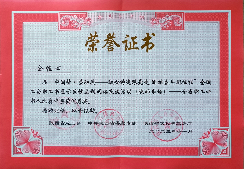 近日 太阳集团下载,龙钢公司轧钢厂职工仝佳心在“中国梦·劳动美——凝心铸魂跟党走团结奋斗新征程”全国工会职工书屋示范性主题阅读交流活动(陕西专场)——全省职工讲书人比赛中荣获优秀奖。
