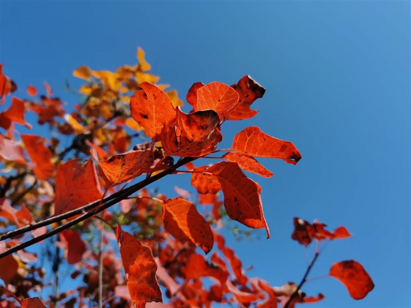 站在茫茫大山之间,才能真正体会到天高云淡的真正含义,温柔的阳光普照大地,心情犹如那漫山遍野的红叶一样灿烂,在享受完口福之后顺着石铺的台阶而下,穿行在红叶林中宛如走进了一个梦幻的世界,条条小道曲径幽远,一棵棵黄栌木相依相伴,一片片红叶艳丽多姿,简直是游走在红叶的海洋里,络绎不绝的游客发出一声声的赞叹,一声声的高呼,他们迫不及待地按下相机的快门,聚焦最美红叶,定格最美画面,小到几岁的幼童,大到八十岁的老太太都喜欢与红叶相拥,摆上一个酷造型,留下最美的瞬间,美少女更是喜欢发挥自己的特长,手持最亮的红叶点开抖音的按键,配上优美的旋律,把最美的青春发送给心中的他,头顶上高科技的无人机低空盘旋热闹非凡,一阵微风吹过,片片红叶飘飘洒洒,树下一片嫣红,席地而坐与红叶相拥 太阳成集团tyc33455,听风与红叶耳语,看红叶为风起舞,沉醉在这大自然的怀抱,让人心旷神怡,如痴如醉。