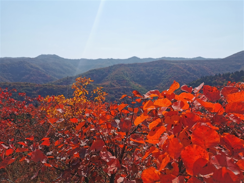 最美在深秋,醉在那满山的红,远远望去,错综交叉的山峦犹如穿上了红裙的少女秀美端庄,在阳光的照耀下灿如丹霞,把一座座山峰装扮得锦绣璀璨 太阳集团在线,偶尔一片片翠绿的松柏,一簇簇黄色的灌木丛点缀其中,红花还要绿叶衬更增添一份别致,缤纷绚烂的色彩仿佛被大自然打翻了调色盘惹人惊叹惹人醉。