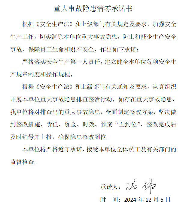 太阳成集团官方版 - 重大事故隐患清零承诺书