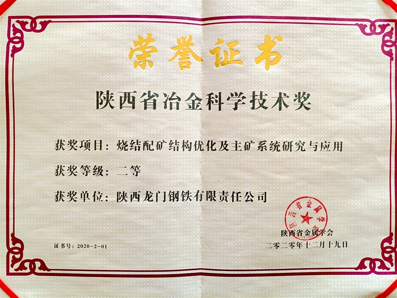 近日,从陕西省金属学会获悉,龙钢公司炼铁厂《烧结配矿结构优化及主矿系统研究与应用》项目喜获“陕西省冶金科学技术奖”二等奖 太阳成集团tyc33455。